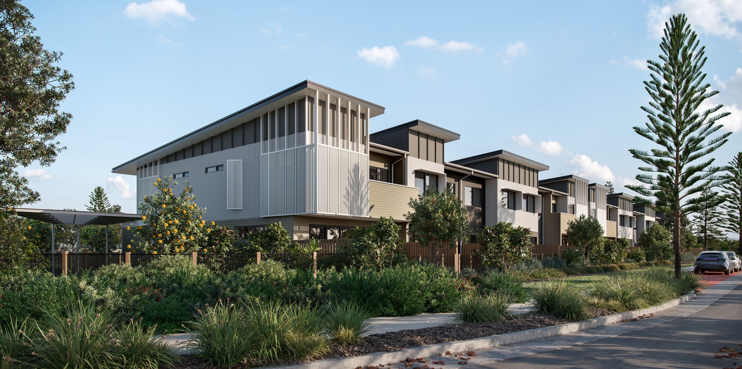 These thoughtfully crafted town homes blend contemporary coastal style with modern comforts. Buyers can choose from three or four bedroom options, each featuring open plan living, hybrid timber flooring, stone benchtops and luxurious bathrooms. Additional features include multi-purpose rooms, terraces, balconies and double garages with epoxy flooring. Sustainability is a key focus, with creative landscaping, native plantings, and energy efficient designs seamlessly integrated into the community.